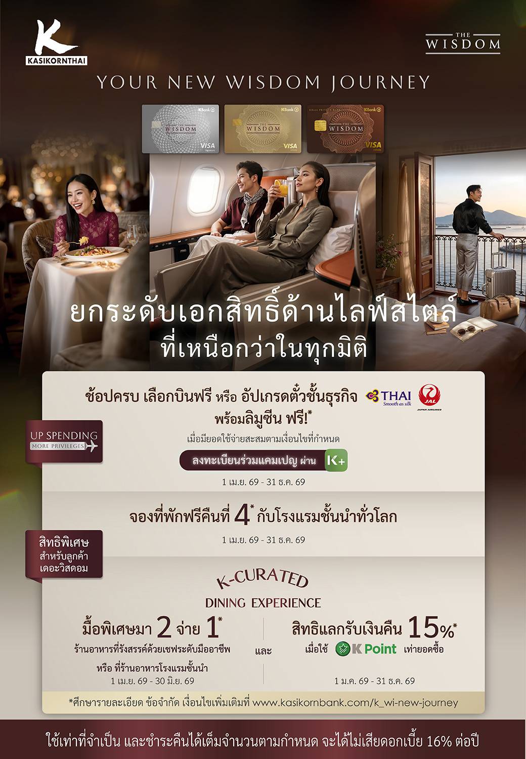 เดอะวิสดอมกสิกรไทย* (KBank THE WISDOM) เดินหน้าสู่ก้าวใหม่ของการยกระดับสิทธิพิเศษด้วยบัตรเครดิตเดอะวิสดอมกสิกรไทย ภายใต้แนวคิด “Your New WISDOM Journey” พร้อมอัปเกรดประสบการณ์ให้ตอบโจทย์ไลฟ์สไตล์ที่หลากหลายและมีความหมายยิ่งขึ้น จับมือกับ วีซ่า (Visa) มอบประสบการณ์เอ็กซ์คลูซีฟ ครอบคลุมทั้งการเดินทาง การพักผ่อน และการใช้ชีวิตระดับลักชูรี ผ่านแคมเปญ “UP SPENDING MORE PRIVILEGES” ลูกค้าสามารถเปลี่ยนทุกการใช้จ่ายผ่านบัตรเครดิตเดอะวิสดอมกสิกรไทยให้เป็นประสบการณ์เอ็กซ์คลูซีฟ ครอบคลุมทั้งเลือกตั๋วเครื่องบิน หรือเลือกอัปเกรดสู่ชั้นธุรกิจ พร้อมบริการลิมูซีนรับ-ส่ง รวมถึงสิทธิพิเศษด้านการท่องเที่ยวและไลฟ์สไตล์ อาทิ พักฟรีคืนที่ 4 ในโรงแรมระดับเวิลด์คลาสทั่วโลก และประสบการณ์มื้ออาหารเอ็กซ์คลูซีฟกับ K-Curated Dining Experience พร้อมสิทธิพิเศษมา 2 จ่าย 1 และแลก K Point รับเครดิตเงินคืนสูงสุด 15% ระหว่างวันที่ 1 เมษายน 2569 – 31 ธันวาคม 2569