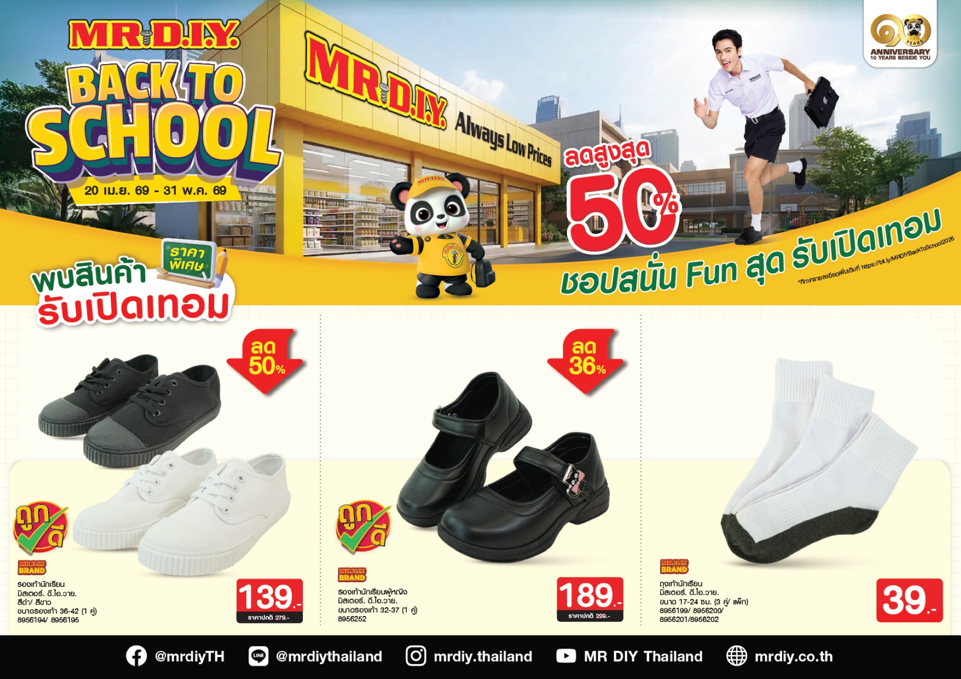 ควบคู่กับความสนุก มิสเตอร์. ดี.ไอ.วาย. ยังส่งมอบความคุ้มค่าผ่านโปรโมชัน “Back to School” ลดสูงสุด 50% ครอบคลุมสินค้าจำเป็นสำหรับนักเรียนและครอบครัว อาทิ รองเท้านักเรียน ถุงเท้า เครื่องเขียน และของใช้ในชีวิตประจำวัน ตั้งแต่วันที่ 20 เมษายน – 31 พฤษภาคม 2569