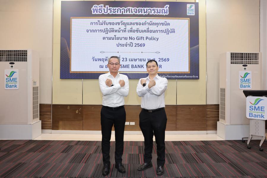 นายเดชา จาตุธนานันท์ ผู้ตรวจราชการกระทรวงอุตสาหกรรม และประธานกรรมการ พร้อมด้วยคณะกรรมการธนาคาร นายพิชิต มิทราวงศ์ กรรมการผู้จัดการ ผู้บริหาร และเจ้าหน้าที่ ธนาคารพัฒนาวิสาหกิจขนาดกลางและขนาดย่อมแห่งประเทศไทย (ธพว.) หรือ SME D Bankร่วมประกาศเจตนารมณ์“การไม่รับของขวัญของกำนัลทุกชนิดจากการปฏิบัติหน้าที่” เพื่อขับเคลื่อนการปฏิบัติตามนโยบาย No Gift Policy ประจำปี 2569 พร้อมร่วมกันกล่าวคำปฏิญาณตนที่จะบริหารและปฏิบัติงานตามภารกิจด้วยความซื่อสัตย์ สุจริต โปร่งใส มีคุณธรรม กล้ายืนหยัดในสิ่งที่ถูกต้อง ยึดมั่นในจริยธรรมและจรรยาบรรณ สร้างวัฒนธรรมองค์กรที่มีจิตสำนักดีปลอดจากการทุจริตทุกรูปแบบ สอดคล้องตามหลัก ESG ดำเนินภารกิจเป็นมิตรต่อสิ่งแวดล้อม (Environment) รับผิดชอบต่อสังคม (Social) และยึดหลักธรรมาภิบาล (Governance) และเป็นไปตามแนวทางการประเมินคุณธรรมและความโปร่งใสในการดำเนินงานของหน่วยงานภาครัฐ (ITA) ประจำปี 2569 สำหรับกิจกรรมครั้งนี้ จัดพร้อมกันทั่วประเทศ สำนักงาน SMED Bank ควบคู่กับสาขาต่าง ๆ ทั่วประเทศผ่านระบบออนไลน์ เมื่อวันที่ 23 เมษายน 2569