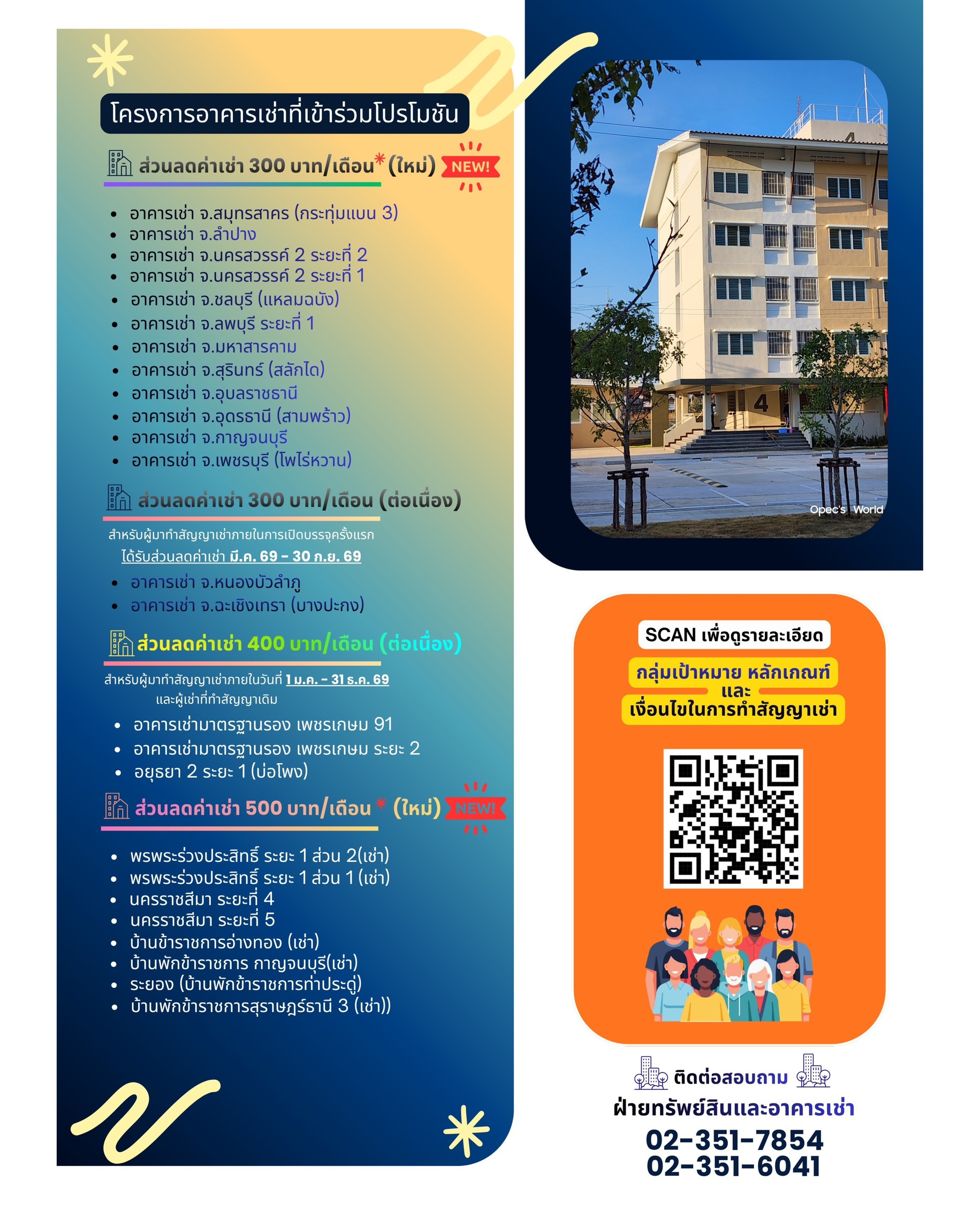 ส่วนโครงการที่ได้รับส่วนลด 400 บาทต่อเดือน ได้แก่ อาคารเช่ามาตรฐานรอง เพชรเกษม 91 เพชรเกษม ระยะที่ 2 และอยุธยา 2 ระยะที่ 1 (บ่อโพง) สำหรับผู้ที่ทำสัญญาเช่าภายในช่วงเดือนมกราคมถึงวันที่ 31 ธันวาคม 2569